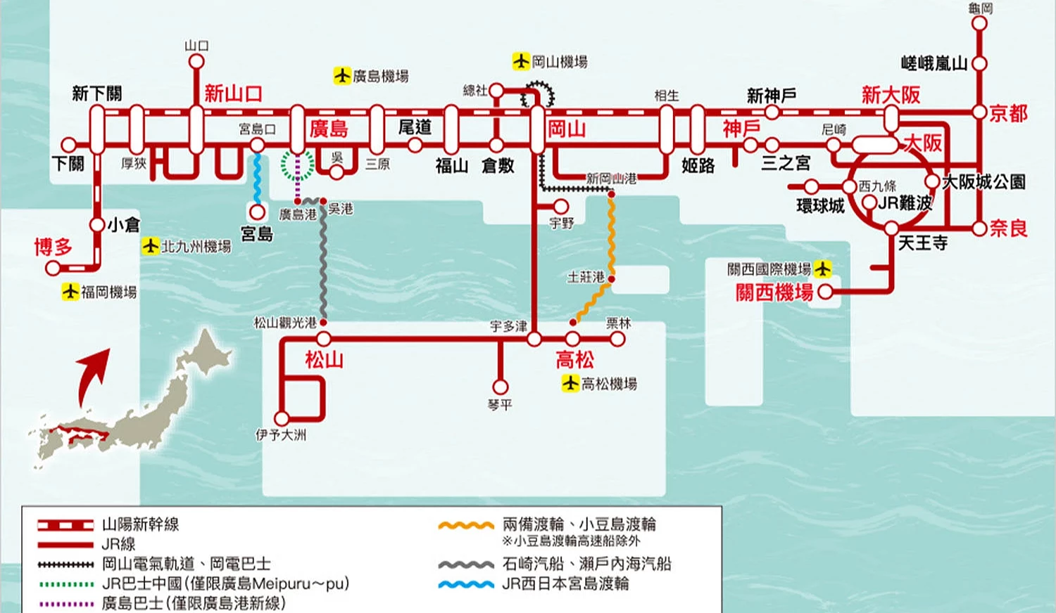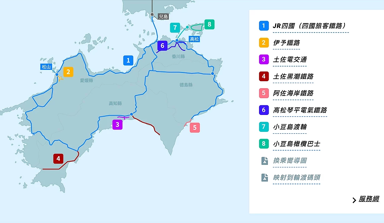 ③除鐵道外,也包含部分渡輪與巴士:例如從高松港出發至小豆島的普通渡輪,以及小豆島上的橄欖巴士(Olive Bus)路線。