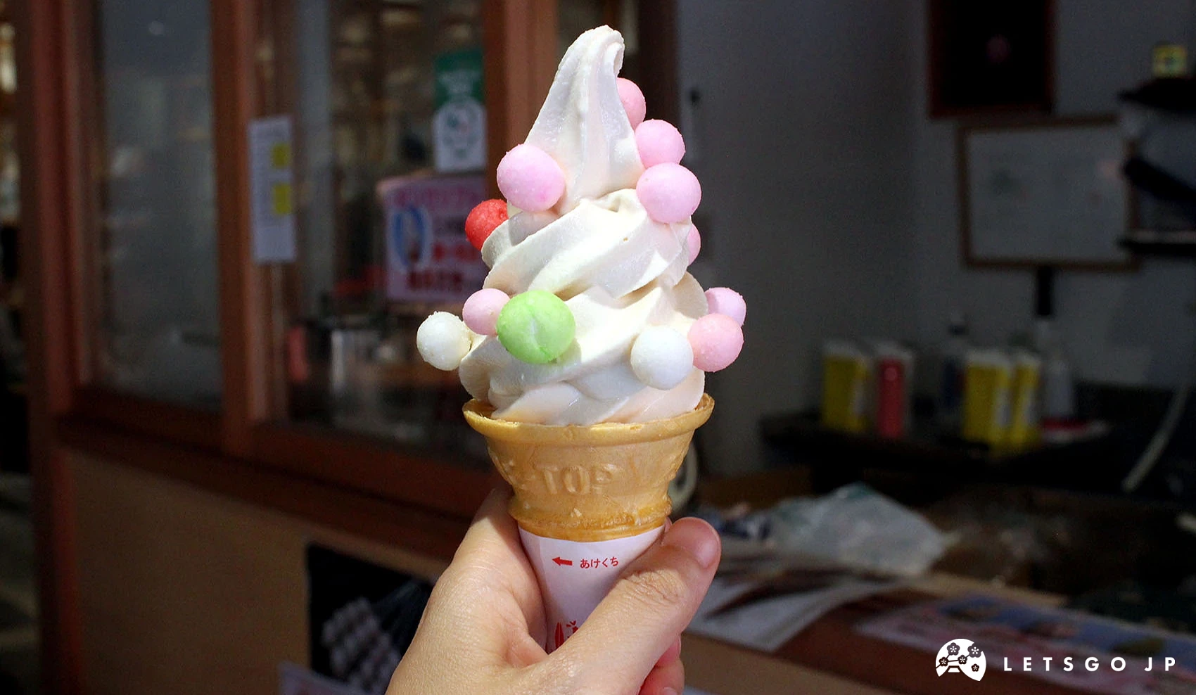 「OIRI 霜淇淋」是一種傳統吉祥點心「おいり(OIRI)」創意結合霜淇淋的當地人氣甜點。 OIRI 是直徑約1公分的彩色米果,常作結婚禮物,象徵勤勞與祝福。這裡多處都可以買到「OIRI 霜淇淋」,色彩繽紛,可愛美味,是參拜散步時的人氣甜點。
